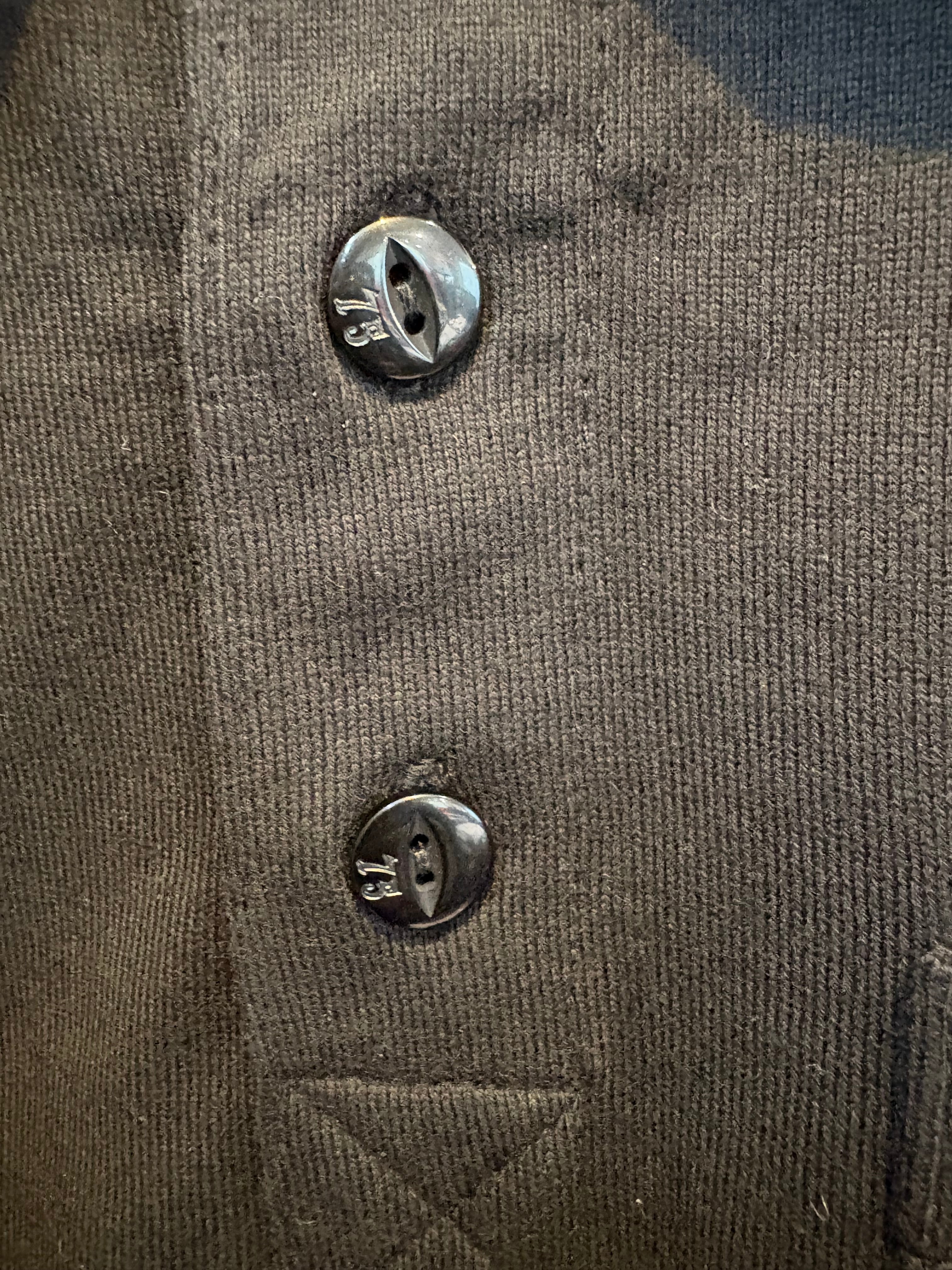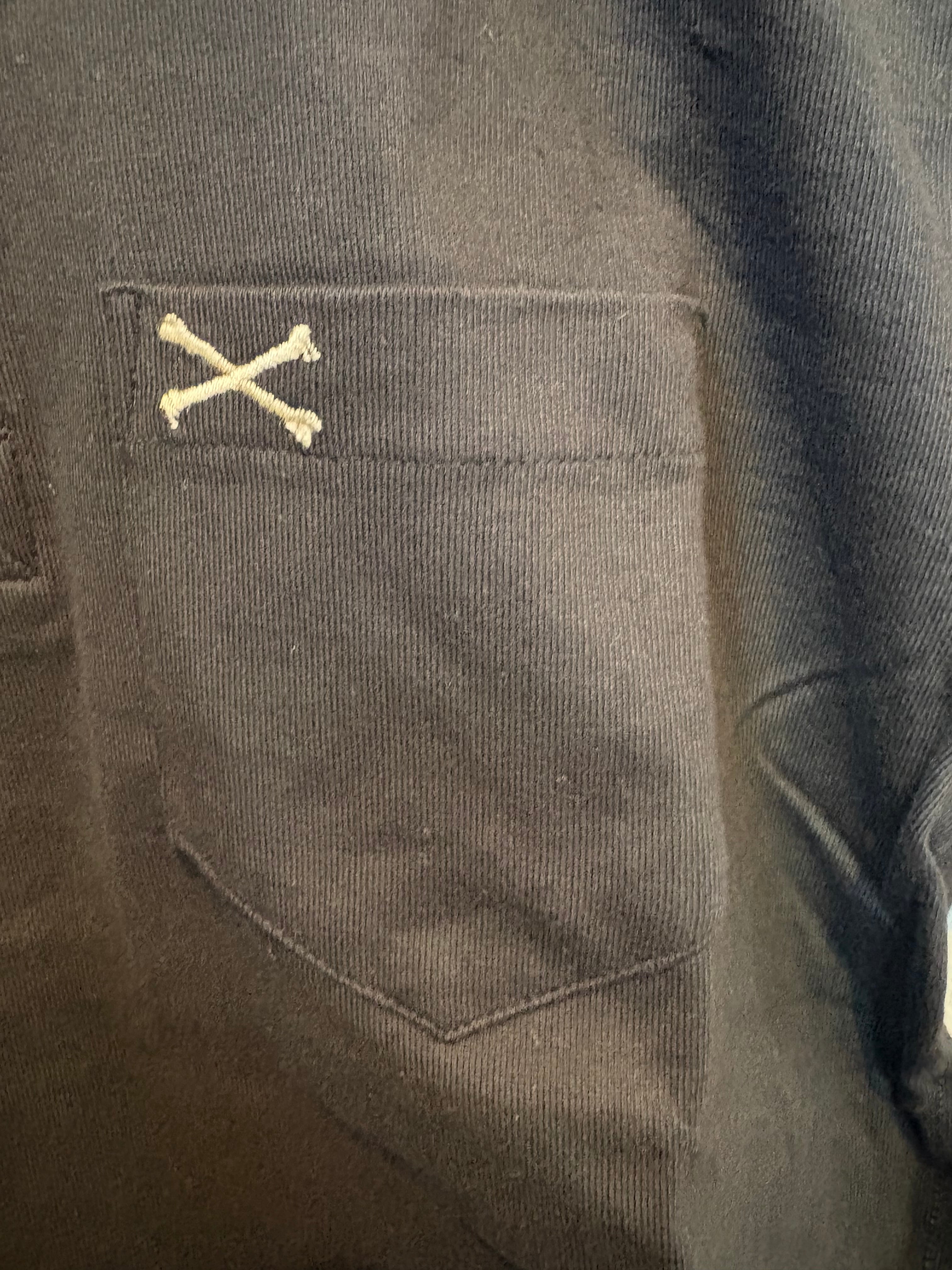 胸元にクロスボーンの刺繍と、VANSONの創業年が刻まれたネコ目ボタンで、シンプルな中にも拘りの感じられるコーディネイトができます。
